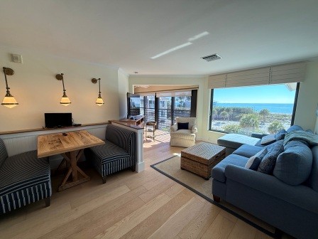 overlooking the Gulf of Mexico. Living room has queen sleeper sofa and gas fireplace.